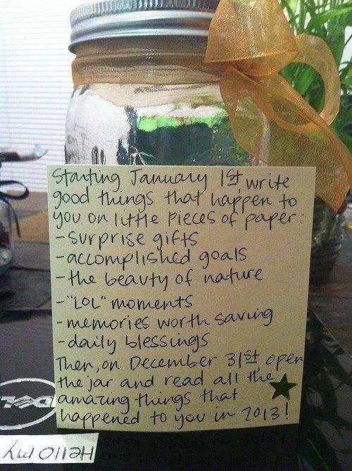 Starting the 1st of January write down the good things that happen to you, on little bits of paper: Surprise gifts, Accomplished goals, The beauty of nature, Laugh out loud moments, Memories worth saving, Daily blessings – Then on the 31st of December you get to open the jar and read all the amazing things your 2014 was filled with.