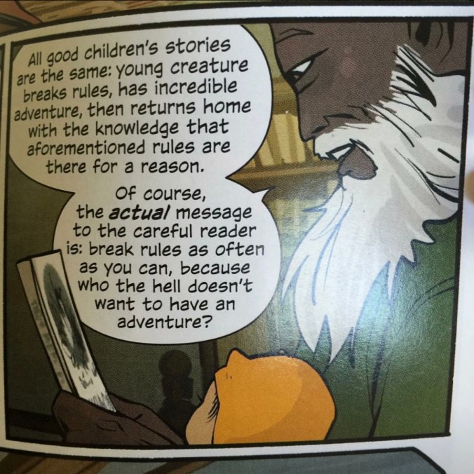 Brian K. Vaughan and Fiona Staples’s SAGA. If you haven’t heard of SAGA you must have been living under a rock for the past three years. This epic sci-fi/fantasy (for mature readers) follows new parents Marko and Alana (narrated by Hazel, their daughter) as they dodge those who don’t approve of their inter species family and seek to destroy them. Marko and Alana strive to create a loving family and figure out how parenthood works all while avoiding the battles going on around the universe due to a long running galactic war between their peoples. Goodreads.